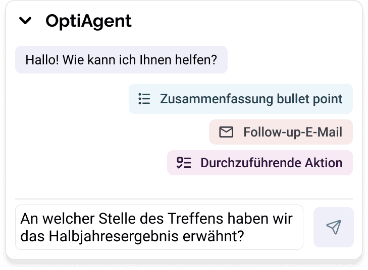 Stellen Sie dem OptiAgent jede beliebige Frage zu Ihren Besprechungen. Er kann personalisierte Zusammenfassungen und Follow-up-E-Mails verfassen und jede Information im Nu finden oder überprüfen.